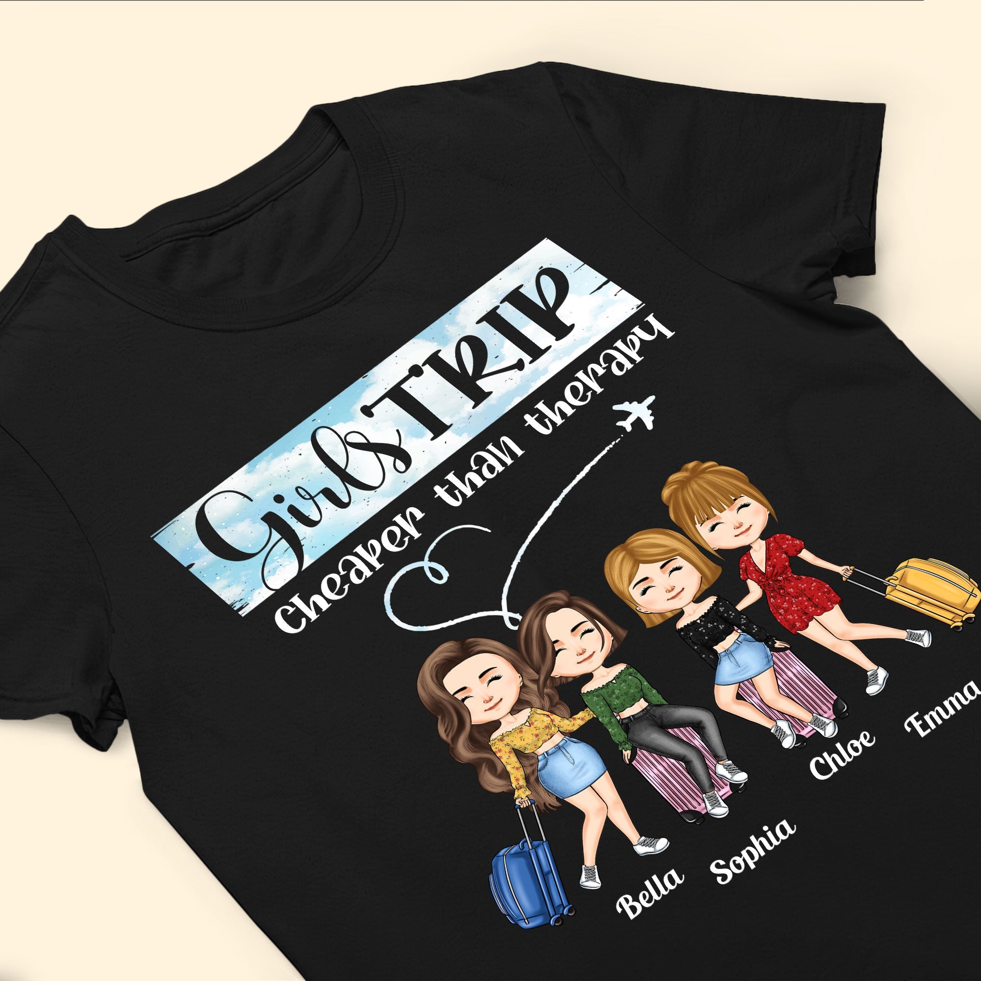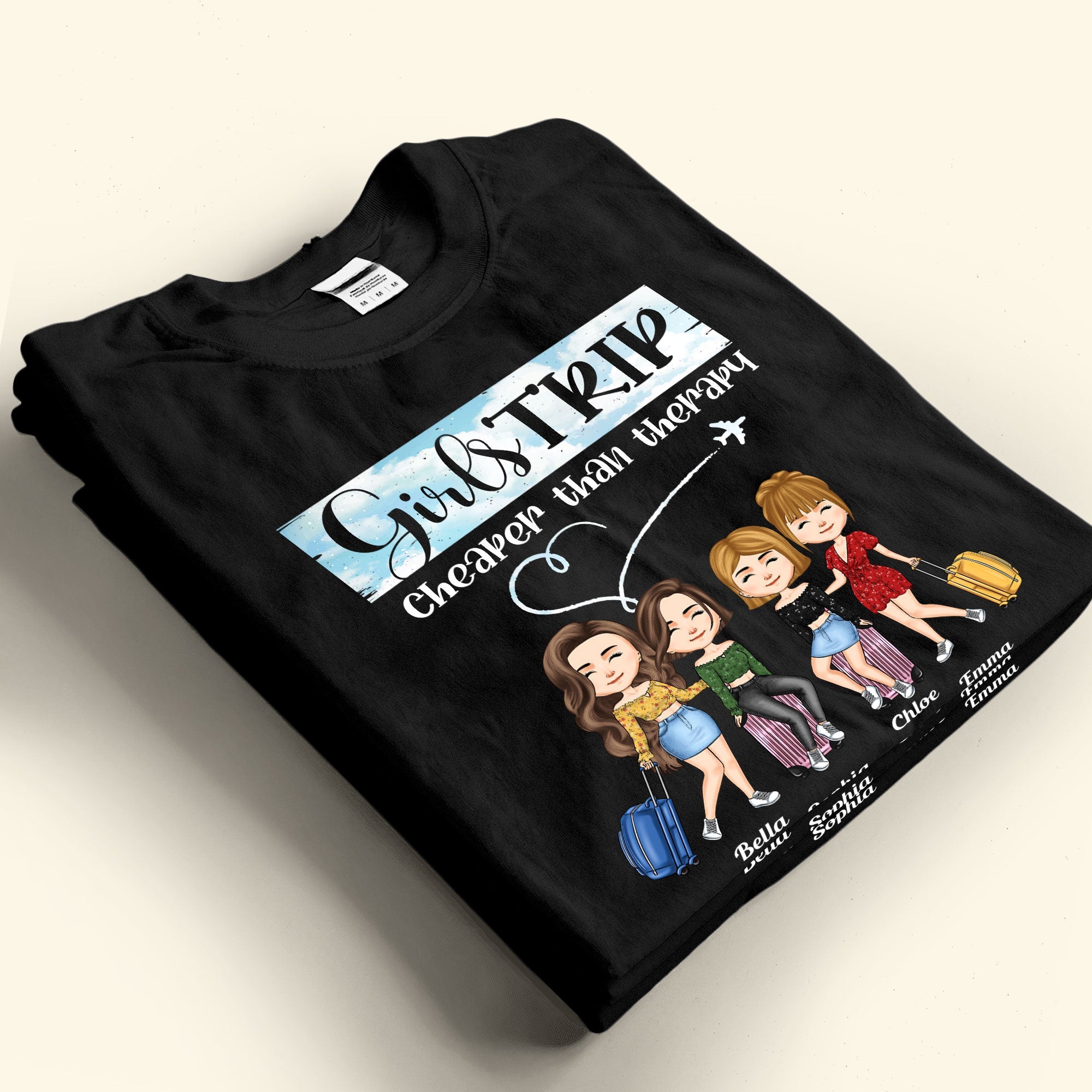 Do you have a group of friends who are always ready for a girls’ trip? Do you want to surprise them with a personalized and funny gift that they will wear and love for years to come? If so, you’ll love this personalized shirt that says “Girls Trip. Cheaper Than Therapy”.